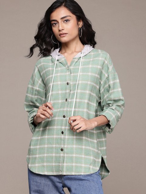 Green pastel checked hooded pure cotton flannel shacket, has a full button placket, long drop-shoulder sleeves, longline length with curved hem