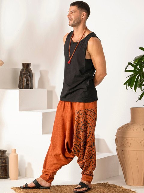 Orange-colored tribal printed loose-fit harem pants with gathers and pleats details, each has an elasticated waistband with drawstring closure
