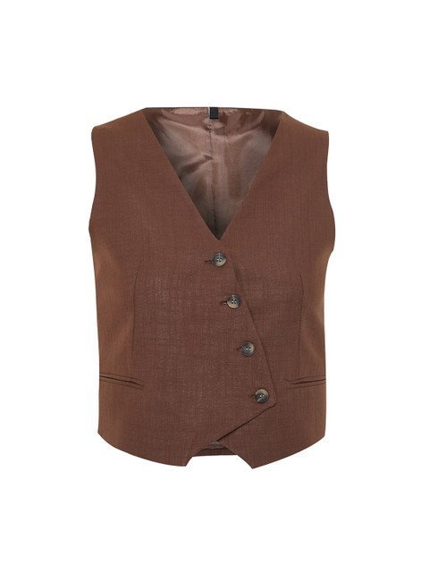 Brown solid regular-fit waistcoat, has a v-neck, overlap front, 2 pockets, sleeveless and button closure