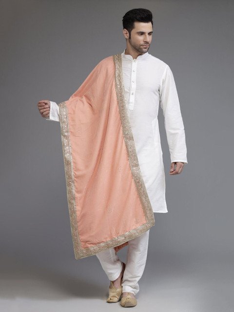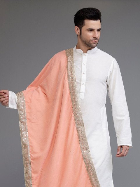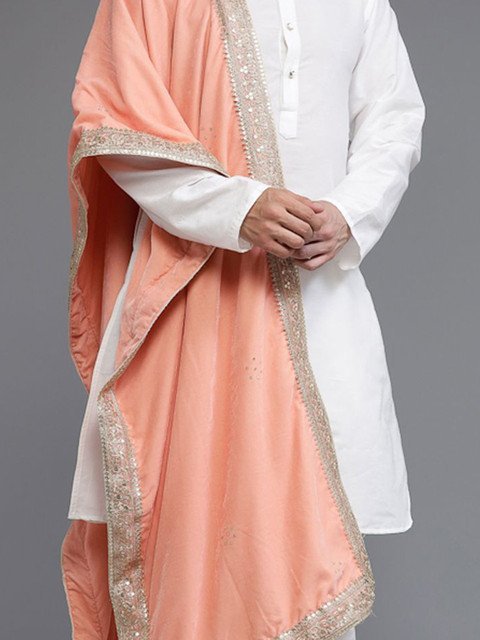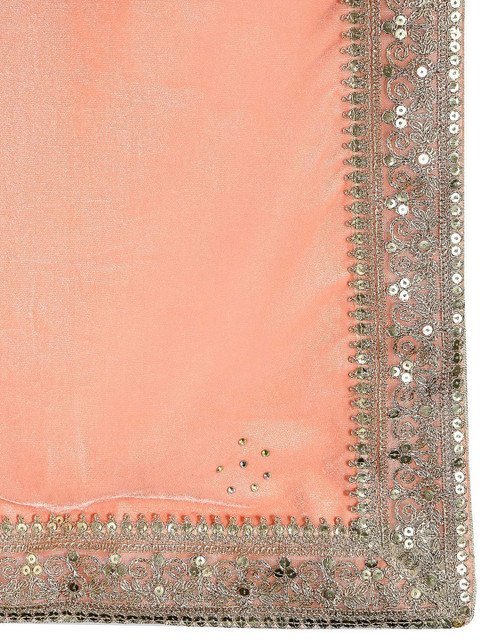 Peach-coloured and silver-toned ethnic motifs embroidered dupatta beads and stones, taping border