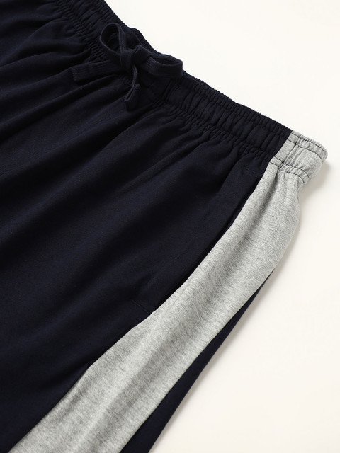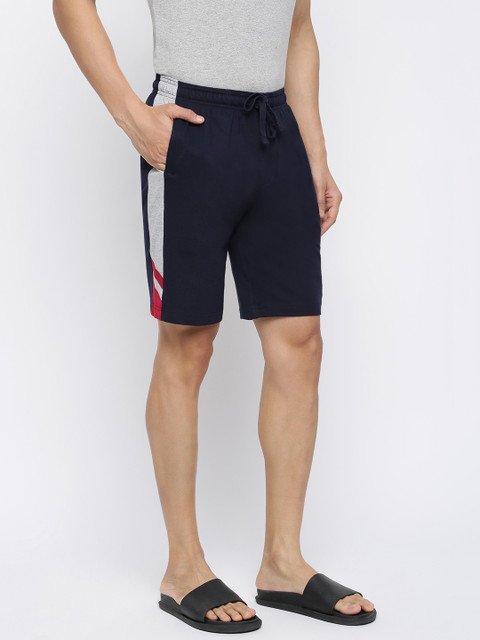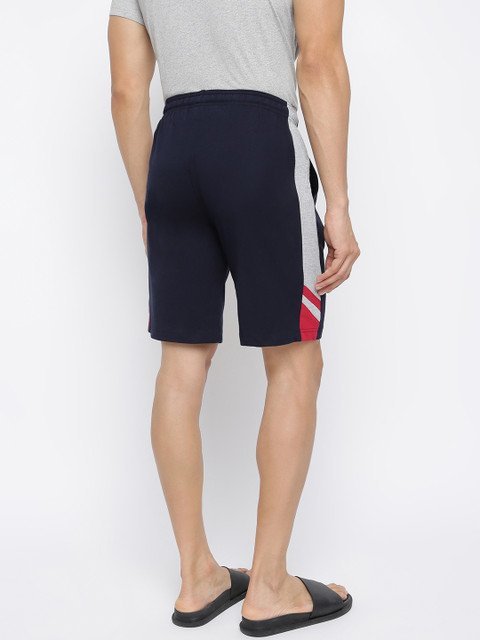 A pair of navy blue mid-rise knitted lounge shorts, has an elasticated waistband with drawstring closure, 2 pockets