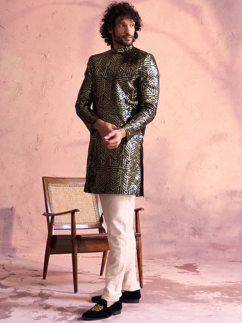 VASTRAMAY Embellished Sequinned Mandarin Collar Sherwani Set
