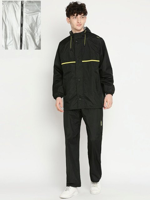 Black and silver solid regular-fit hooded rain jacket, has an attached hood with drawcord toggle, seam-sealed with adjustable hems, a full front zipper placket with flap, cuffs and hood with drawcord, a packable hood and breathable vents at the back, and two flap zipper pockets